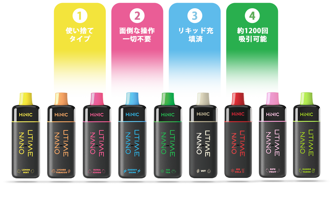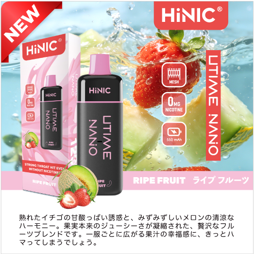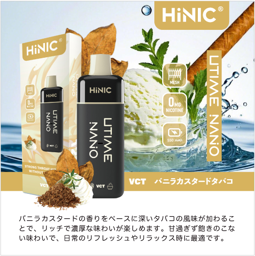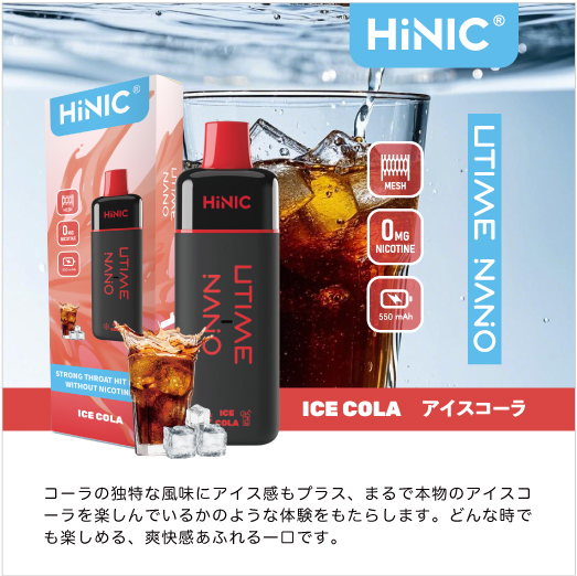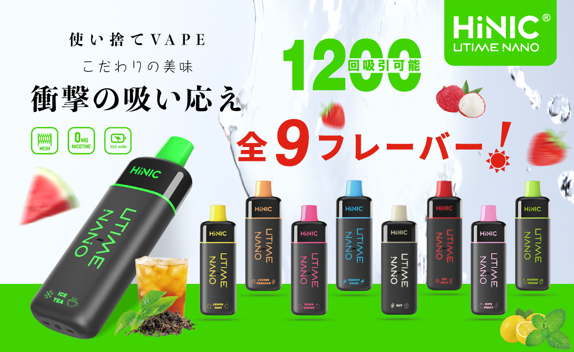 HiNIC Utime Nanoは独自技術でノンニコチンにも関わらず、タバコのようなキック感を体験できる吸い応え抜群の使い捨てVAPEです。また、メッシュコイルを採用して、リキッドを効率的に気化でき、リアルな風味を再現され、吸い心地さらにアップ!これ1本で「VAPE」をもっと簡単に美味しくお楽しみいただけます。